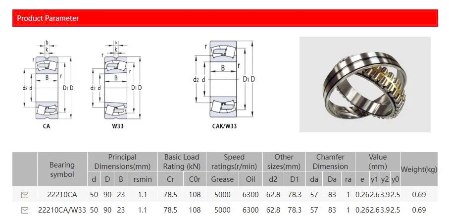 Vòng bi 22210 CA/W33C3 là loại vòng bi tang trống tự lựa 2 dãy, chuyên dùng cho các trục ép hoặc hệ thống băng tải tải trọng trung bình. Thiết kế lồng đồng CA giúp tăng độ cứng và chịu nhiệt tốt, đặc biệt hiệu quả khi máy hoạt động liên tục. Rãnh tra mỡ W33 và khe hở C3 giúp bảo trì dễ dàng và tăng tuổi thọ thiết bị.