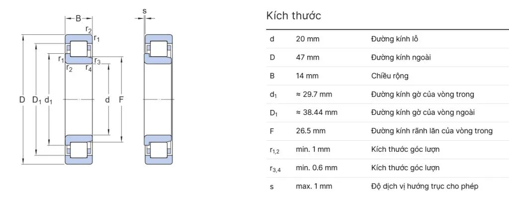 Vòng Bi NJ là loại vòng bi đũa một dãy với 2 gờ cố định ở vòng ngoài và 1 gờ ở vòng trong. Thiết kế này giúp định vị trục theo một hướng, ngăn chặn dịch chuyển dọc trục không mong muốn. Phù hợp cho thiết bị chịu tải hướng kính lớn và cần vận hành ổn định ở tốc độ cao.