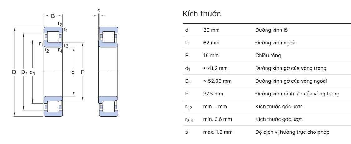 | Kích thước | 30×62×16 mm | Trục trong 30 mm, ngoài 62 mm, bề rộng 16 mm |