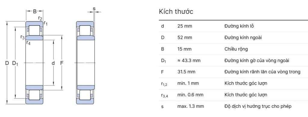 Kích thước (d × D × B) 25 × 52 × 15 mm Đường kính trong × ngoài × bề rộng