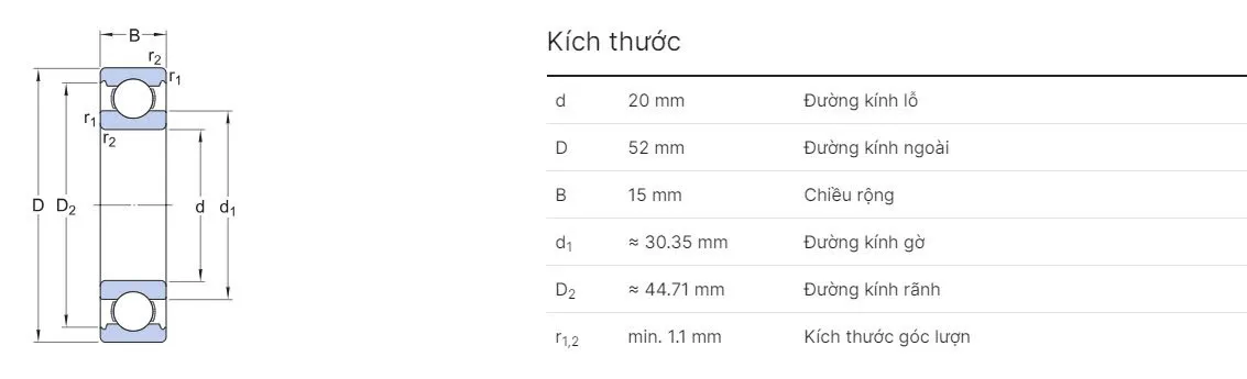 Kích thước (d x D x B) 20 x 52 x 15 mm Đường kính trong – ngoài – chiều rộng theo chuẩn ISO 15