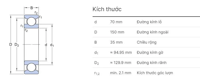 Sản phẩm được thiết kế với kích thước 70x150x35 mm, cấp chính xác P5, vật liệu thép GCr15, đáp ứng nhu cầu về vòng bi 6314 Trung Quốc giá tốt – thay thế hiệu quả cho hàng nhái SKF/NSK.